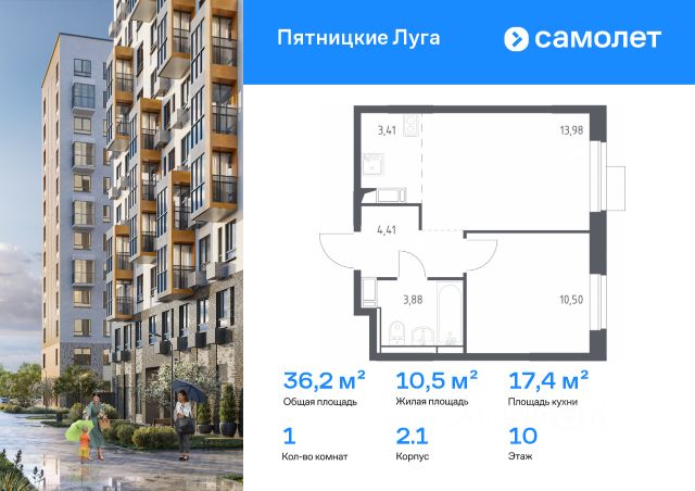 Продажа 1-комнатных квартир на 10 этаже в деревне Юрлово Московской области