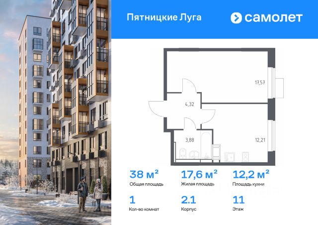 Однушка с балконом на 11 этаже 12-этажного дома, общей площадью 34,98 кв.м