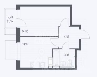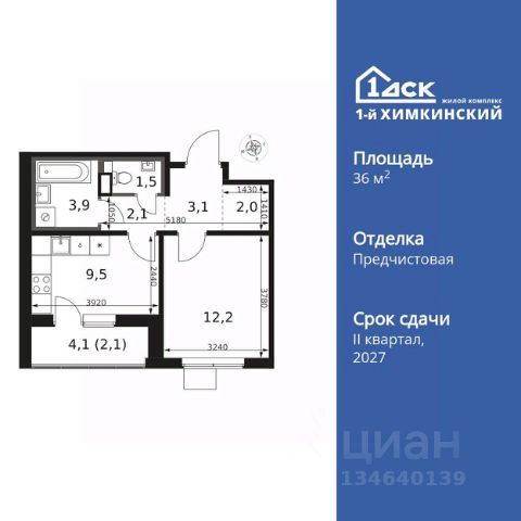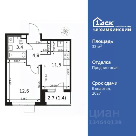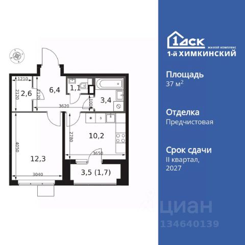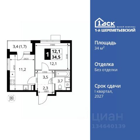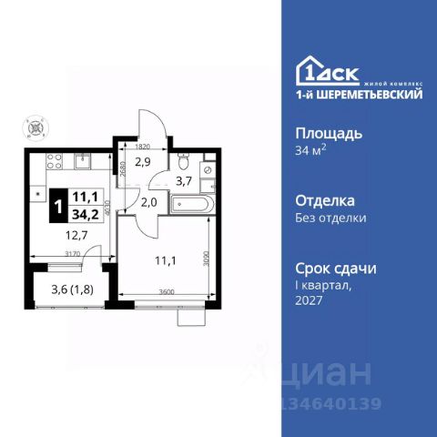 Однушка с балконом на 11 этаже 12-этажного дома, общей площадью 34,98 кв.м