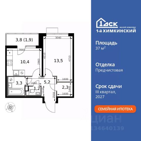 БЕЗ ПЕРВОНАЧАЛЬНОГО ВЗНОСА! ТОЛЬКО 4 ДНЯ ДО 10.02 • Дополнительная скидка 10% • Ставка 10% по стандартной ипотеке для всех без наценок • Ставка 3,5% по семейной ипотеке Успейте купить выгодно! Прямая продажа от застройщика! Жилой Комплекс класса Комфорт. Продаётся 1-к квартира номер 272 общей площадью 37.4 кв.м. на 13-м этаже 16 этажного здания. Без отделки. Особенности квартиры: - Мастер-зона с гардеробной. Просторное место для отдыха и удобного хранения вещей. - Линейная планировка - максимальная функциональность и удобство. - Гардеробная - удобство для хранения и организации вещей. - Ниша под шкаф - компактное и удобное место для вещей. - Лоджия - уютное место для отдыха и тишины. Информация о комплексе: Квартал класса комфорт плюс, где современное городское пространство граничит с удивительной природой вокруг. 1-й Химкинский расположен на территории в 102 га и органично вписан в природное окружение Химкинского леса и канала им. Москвы. В проекте предусмотрена богатая коммерческая инфраструктура с собственным торговым центром, общеобразовательные учреждения и социальные объекты. Изюминкой жилого комплекса будут спортивно-оздоровительный комплекс с термами и SPA и семейный парк развлечений. Транспортная доступность: ЖК "1-й Химкинский" дает возможность выбрать любой способ передвижения как до города, так и до самых разных объектов, которые могут представлять интерес для его жителей. Не важно, какой способ передвижения вы предпочитаете, успевать всегда и везде можно вне зависимости от выбора транспорта. - 8 мин. пешком (800 м) до остановки "Золотая Арка" -10 мин пешком (1 км) до остановки "Поворот на Ивакино" Внутренняя инфраструктура: - Безопасность: закрытые дворы без машин, безбарьерная среда и сквозные подъезды, камеры на детских площадках с возможностью трансляции на смартфоне - Идеальный отдых в кругу семьи: семейный парк развлечений на территории, торговый центр (2-х этажный) общей площадью более 8 тыс. кв. м с фудкортом - Образование: 3 детских сада и современная муниципальная школа на 2450 мест - Спортивная среда: закольцованный веломаршрут с навигацией, спортивный комплекс с термами, закрытый тренажерный зал и зоны ворк-аута - Социальные объекты: поликлиника со станцией скорой помощи, пожарное депо - Подземный паркинг и кладовые помещения на -1 этаже, станция техобслуживания и автомойка на территории