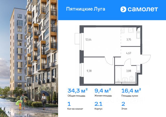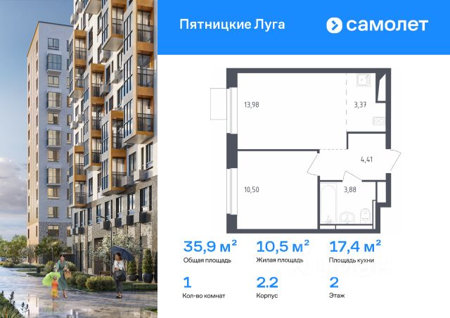 продается однокомнатная квартира с отделкой от застройщика на 2м этаже 12ти этажного дома в ЖК Пятницкие луга, корпус 1.1, секция 8,