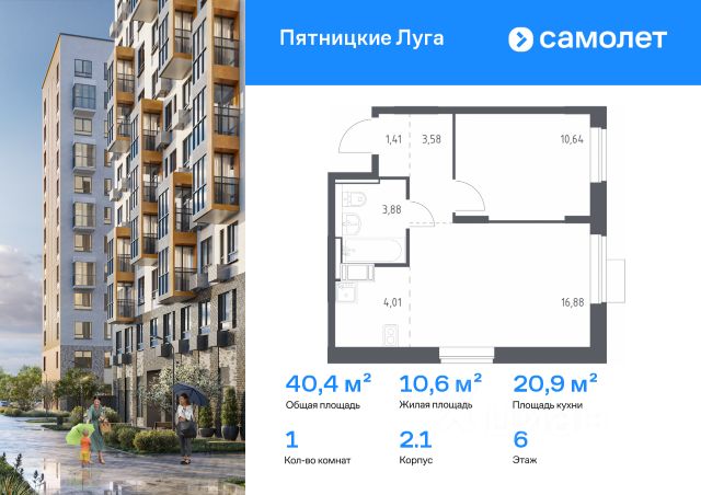 Продажа 1-комнатных квартир на 6 этаже в деревне Юрлово Московской области