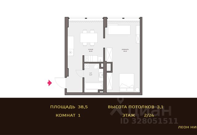 Функциональное и грамотно организованное пространство с выделенной кухонной и обеденной зоной, а также отдельной жилой комнатой. В отделке использованы качественные материалы: напольное покрытие — износостойкий ламинат, аккуратные и современные решения по интерьеру. Апартаменты полностью укомплектованы всей необходимой техникой и мебелью: кухонный гарнитур, посудомоечная машина, духовой шкаф и всё необходимое для комфортной жизни. Формат — заезжай и живи без дополнительных вложений, что особенно важно как для личного проживания, так и для быстрой сдачи в аренду. Отдельного внимания заслуживают увеличенные окна — они не в пол, но значительно больше стандартных, за счёт чего в помещении много естественного света и создаётся ощущение пространства. Просторный санузел оборудован полноценной ванной. Высокие потолки 3.1 м!