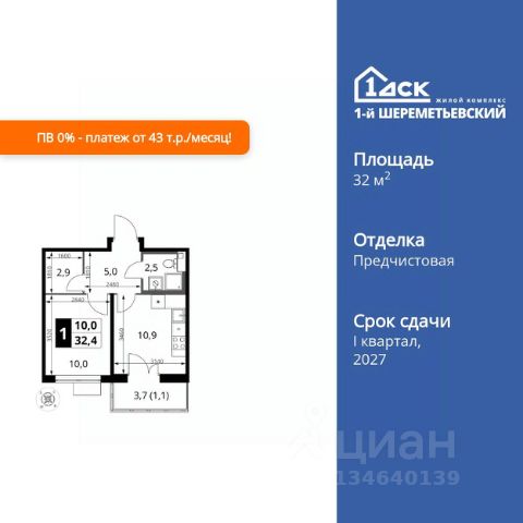 ТОЛЬКО 4 ДНЯ ДО 10.02 • Дополнительная скидка 10% • Ставка 10% по стандартной ипотеке для всех без наценок • Ставка 3,5% по семейной ипотеке Успейте купить выгодно! Прямая продажа от застройщика! Жилой Комплекс класса Комфорт Плюс. Продаётся 1-к квартира номер 1007 общей площадью 34 кв.м. на 12-м этаже 17 этажного здания. Без отделки. Особенности квартиры: - Линейная планировка - максимальная функциональность и удобство. - Можно оборудовать рабочее место - комфорт для работы и учёбы. - Линейная кухня - функциональность и практичность в одном решении. - Лоджия - уютное место для отдыха и тишины. Информация о комплексе: ЖК 1-й Шереметьевский расположен в самом центре Подрезково, от него всего 6 минут пешком до одноименной станции ж/д и планируемой к открытию МЦД-3. В комплексе яркие и уютные, лобби, большая колясочная, лапомойка. Благодаря гостевому санузлу на 1 этаже прогулки станут по-настоящему долгими. Два лифта пассажирский и грузовой.Во всех корпусах 1-го Шереметьевского там устроены кладовые, а в корпусах 3-5 есть подземный паркинг. В ЖК 1-й Шереметьевский разнообразие площадей и планировок. Большие кухни-гостиные: в них два окна или больше. Во всех квартирах площадью от 40 кв.м. и выше спроектировано 2 санузла. Большие остекленные лоджии с отделкой. Система Умная квартира, реализованная в 1-м Шереметьевском. В каждой квартире установлены датчики протечек и запорные вентили с электроприводом, которые самостоятельно перекрывают воду в случае аварии. Мобильное приложение управляет группами электропотребителей: даже если вы забыли утюг включенным, можно обесточить его дистанционно. Транспортная доступность: - Общественный транспорт: До ближайших станций метро Планерной и Войковской около 40-50 минут на автобусе. 6 минут до ЖД станции Подрезково (МЦД-3) - Личный автотранспорт: Удобный выезд на Ленинградское шоссе позволяет быстро добираться до МКАДа и в центр Москвы, до платной трассы М11 и в аэропорт Шереметьево. 3 минуты до Ленинградского ш. 10 минут до платной трассы М11 15 минут до МКАД 20 минут до ст. м Войковская 25 минут до ст. м Планерная Внутренняя инфраструктура: 1-й Шереметьевский не только сокращает время, которое вы будете проводить в дороге. Но и предпринимает многое, чтобы вы меньше ездили и чаще ходили. На первых этажах корпусов разместятся фрешмаркеты и пункты выдачи маркетплейсов, салоны красоты и химчистки, кофейни и пекарни всё, что необходимо изо дня в день, но не заслуживает отдельной поездки на машине или такси. В квартале будут построены собственные школа и детский сад. Школа рассчитана на 1100 учеников. В ней будут 25-метровый бассейн и просторный атриум, медиатека. Детский сад рассчитана на 400 малышей. Здесь стильный дизайн и комфортные группы, большой физкультурный зал и просторный зал для занятия музыкой. Дворы без машин. Безопасные детские площадки. Вдоль корпусов организованы зоны тихого отдыха: детский гомон с далеких каруселей и горок не достигне