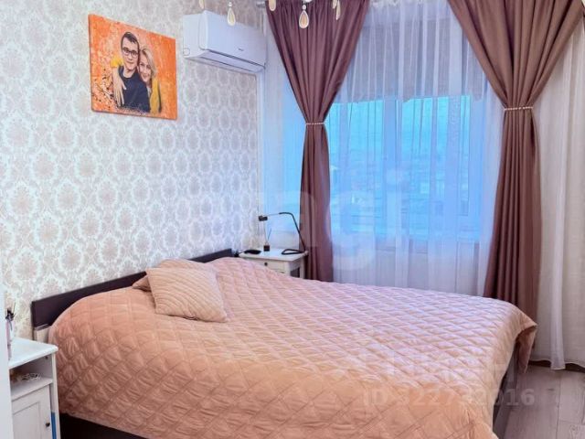 В спальне большой шкаф, комод, рабочий стол, высокая двуспальная кровать, обращенная к окну и кондиционер. Мебель - ИКЕА.