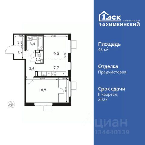 Прямая продажа от застройщика! Жилой Комплекс класса Комфорт. Продаётся 2-к квартира номер 329 общей площадью 45.1 кв.м. на 4-м этаже 8 этажного здания. Отделка Whitebox. Особенности квартиры: - Угловая планировка - больше пространства для ваших идей. - Увеличенное количество окон - дополнительное освещение и свежий воздух. - Раздельный санузел - больше удобства для всех членов семьи. - Евроформат - просторное и удобное жилье с отличной планировкой. - Линейная кухня - функциональность и практичность в одном решении. - Гардеробная - удобство для хранения и организации вещей. - Тёплая лоджия - пространство для отдыха в любое время года. Квартира с предчистовой отделкой (White box). Вам не придется заниматься черновыми и трудоёмкими работы, а чистовую отделку и дизайн - сделайте на свой вкус. Информация о комплексе: Квартал класса комфорт плюс, где современное городское пространство граничит с удивительной природой вокруг. 1-й Химкинский расположен на территории в 102 га и органично вписан в природное окружение Химкинского леса и канала им. Москвы. В проекте предусмотрена богатая коммерческая инфраструктура с собственным торговым центром, общеобразовательные учреждения и социальные объекты. Изюминкой жилого комплекса будут спортивно-оздоровительный комплекс с термами и SPA и семейный парк развлечений. Транспортная доступность: ЖК "1-й Химкинский" дает возможность выбрать любой способ передвижения как до города, так и до самых разных объектов, которые могут представлять интерес для его жителей. Не важно, какой способ передвижения вы предпочитаете, успевать всегда и везде можно вне зависимости от выбора транспорта. - 8 мин. пешком (800 м) до остановки "Золотая Арка" -10 мин пешком (1 км) до остановки "Поворот на Ивакино" Внутренняя инфраструктура: - Безопасность: закрытые дворы без машин, безбарьерная среда и сквозные подъезды, камеры на детских площадках с возможностью трансляции на смартфоне - Идеальный отдых в кругу семьи: семейный парк развлечений на территории, торговый центр (2-х этажный) общей площадью более 8 тыс. кв. м с фудкортом - Образование: 3 детских сада и современная муниципальная школа на 2450 мест - Спортивная среда: закольцованный веломаршрут с навигацией, спортивный комплекс с термами, закрытый тренажерный зал и зоны ворк-аута - Социальные объекты: поликлиника со станцией скорой помощи, пожарное депо - Подземный паркинг и кладовые помещения на -1 этаже, станция техобслуживания и автомойка на территории Продается 2-комнатная квартира в новостройке в квартале Международный в микрорайоне Клязьма-Старбеево.
