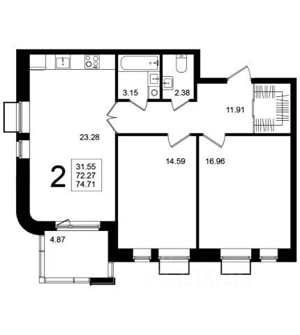 Площадь 40,3 кв.м.+ балкон 3 кв.м.