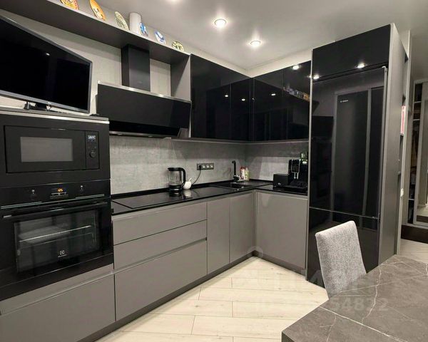 На кухне есть абсолютно все для комфортной счастливой жизни: двухкамерный огромный холодильник с ледогенератором, духовка, индукционная плита, очиститель воды, стиральная машинка с функцией сушки.