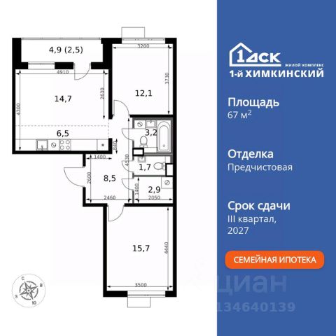 Прямая продажа от застройщика! Жилой Комплекс класса Комфорт. Продаётся 3-к квартира номер 607 общей площадью 67.8 кв.м. на 13-м этаже 16 этажного здания. Предчистовая отделка. Цена с учётом скидки. Особенности квартиры: - Организуем показ в удобное для вас время! - Просторная спальня, в которой можно разместить большую кровать. - Распашная планировка - отличное сочетание удобства и свободы. - Гостевой санузел - комфорт и удобство для ваших гостей. - Евроформат - просторное и удобное жилье с отличной планировкой. - Гардеробная - удобство для хранения и организации вещей. - Просторная лоджия - идеальное место для уютных вечеров. Квартира с предчистовой отделкой. Вам не придется заниматься черновыми и трудоёмкими работы, а чистовую отделку и дизайн - сделайте на свой вкус. Информация о комплексе: "1-й Химкинский": гармония современного города и природы на 102 га у Химкинского леса и канала им. Москвы. Развитая инфраструктура: ТЦ, школы, спорткомплекс с термами и СПА, парк развлечений. Идеальный баланс для жизни в окружении зелени и городского комфорта. Транспортная доступность: ЖК "1-й Химкинский" дает возможность выбрать любой способ передвижения как до города, так и до самых разных объектов, которые могут представлять интерес для его жителей. Не важно, какой способ передвижения вы предпочитаете, успевать всегда и везде можно вне зависимости от выбора транспорта. - 8 мин. пешком (800 м) до остановки "Золотая Арка" -10 мин пешком (1 км) до остановки "Поворот на Ивакино" Внутренняя инфраструктура: Безопасность: закрытые дворы без машин, безбарьерная среда, сквозные подъезды, камеры на детских площадках с трансляцией на смартфон. Отдых: семейный парк развлечений, двухэтажный ТЦ 8 000 м² с фудкортом. Образование: 4 детских сада, 2 муниципальные школы. Спорт: закольцованный веломаршрут, спорткомплекс с термами, тренажерный зал, воркаут зоны. Инфраструктура: поликлиника со станцией скорой помощи, пожарное депо. Паркинг: подземный паркинг, кладовые на -1 этаже, СТО и автомойка на территории. Квартира с предчистовой отделкой - ваш дизайн без черновых работ