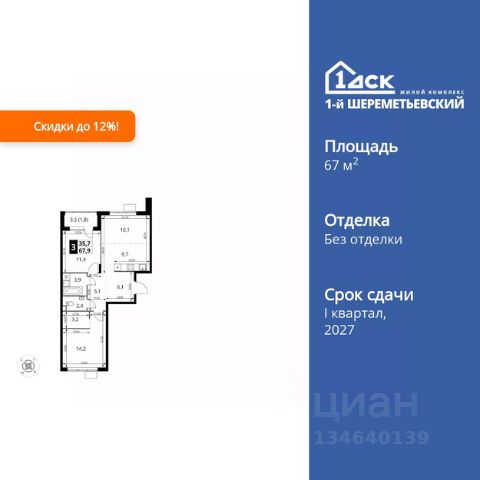 Прямая продажа от застройщика! Жилой Комплекс класса Комфорт. Продаётся 3-к квартира номер 611 общей площадью 67.8 кв.м. на 14-м этаже 16 этажного здания. Отделка Whitebox. Цена с учётом скидки. Особенности квартиры: - Просторная спальня, в которой можно разместить большую кровать. - Распашная планировка - отличное сочетание удобства и свободы. - Гостевой санузел - комфорт и удобство для ваших гостей. - Евроформат - просторное и удобное жилье с отличной планировкой. - Гардеробная - удобство для хранения и организации вещей. - Просторная лоджия - идеальное место для уютных вечеров. Квартира с предчистовой отделкой (White box). Вам не придется заниматься черновыми и трудоёмкими работы, а чистовую отделку и дизайн - сделайте на свой вкус. Информация о комплексе: Квартал класса комфорт плюс, где современное городское пространство граничит с удивительной природой вокруг. 1-й Химкинский расположен на территории в 102 га и органично вписан в природное окружение Химкинского леса и канала им. Москвы. В проекте предусмотрена богатая коммерческая инфраструктура с собственным торговым центром, общеобразовательные учреждения и социальные объекты. Изюминкой жилого комплекса будут спортивно-оздоровительный комплекс с термами и SPA и семейный парк развлечений. Транспортная доступность: ЖК "1-й Химкинский" дает возможность выбрать любой способ передвижения как до города, так и до самых разных объектов, которые могут представлять интерес для его жителей. Не важно, какой способ передвижения вы предпочитаете, успевать всегда и везде можно вне зависимости от выбора транспорта. - 8 мин. пешком (800 м) до остановки "Золотая Арка" -10 мин пешком (1 км) до остановки "Поворот на Ивакино" Внутренняя инфраструктура: - Безопасность: закрытые дворы без машин, безбарьерная среда и сквозные подъезды, камеры на детских площадках с возможностью трансляции на смартфоне - Идеальный отдых в кругу семьи: семейный парк развлечений на территории, торговый центр (2-х этажный) общей площадью более 8 тыс. кв. м с фудкортом - Образование: 3 детских сада и современная муниципальная школа на 2450 мест - Спортивная среда: закольцованный веломаршрут с навигацией, спортивный комплекс с термами, закрытый тренажерный зал и зоны ворк-аута - Социальные объекты: поликлиника со станцией скорой помощи, пожарное депо - Подземный паркинг и кладовые помещения на -1 этаже, станция техобслуживания и автомойка на территории