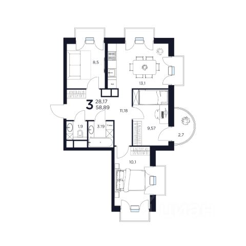 В квартире 2 отдельные комнаты: 19,2 кв.м. и 12,7кв.м., кухня 10,3 кв.м. и застекленная лоджия 5,4 кв.м.