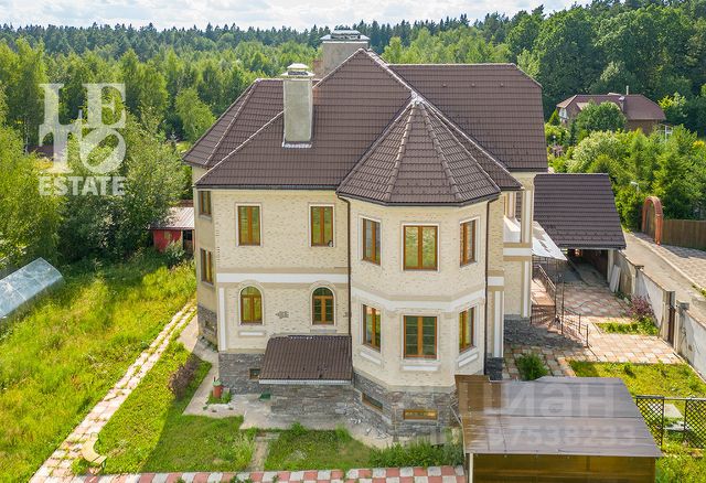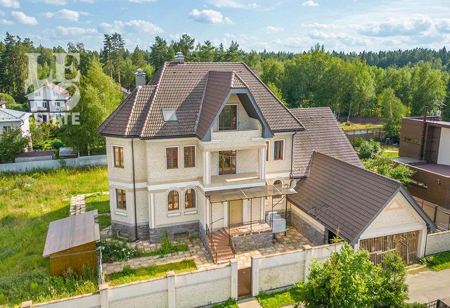 408 кв.м. на бетонном фундаменте, бревенчатый, обложенный кирпичом, оштукатурен, с вставленным каркасом, собранным из "тридцатого швеллера". Перекрытия железобетон, мансарда деревянная, кровля-металлочерепица. Окна - лиственничные стеклопакеты, двухкамерные, приточно-вытяжная вентиляция. Отопление (два газовых котла, один из них включается только в морозы.) Подача тепла и воды снизу.