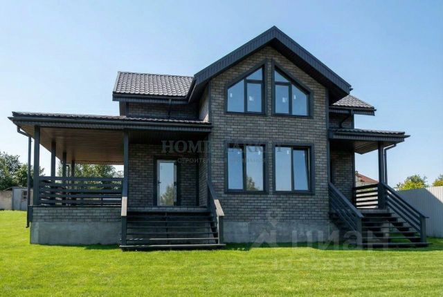 (2 этажа + цоколь + мансарда). Дом брусчатый, облицован кирпичом.