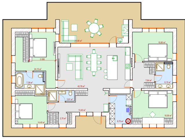 На цокольном этаже бассейн, сауна, тренажёрный зал.