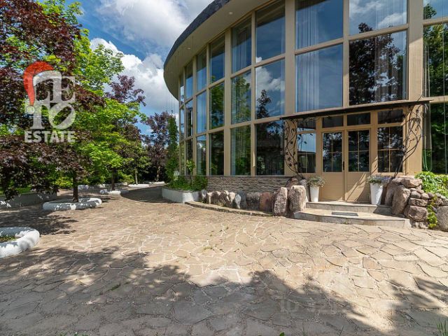 На участке правильной прямоугольной формы, площадью 60 соток, сделаны ландшафтный дизайн, дренаж и ливневстоки. На территории также расположены оранжерея с квартирой для персонала (площадь 150 кв м), гараж (98 кв м) для 2-х автомобилей, большая беседка и вольер для собак.