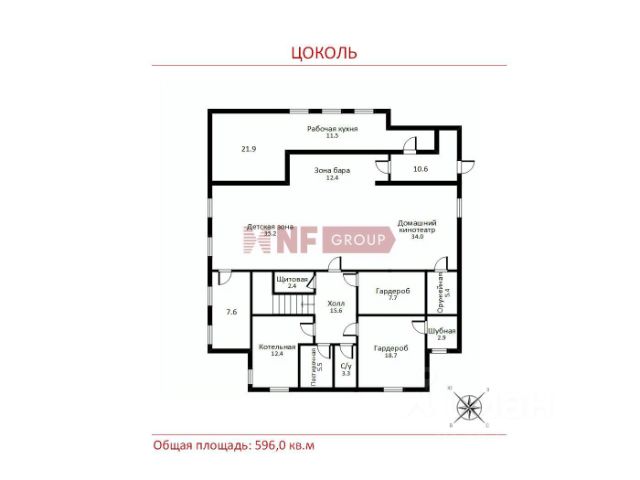 Цокольный этаж: кинотеатр с баром, бильярдная, гараж на три автомобиля, санузел с душевой, электрощитовая, мастерская, комната для персонала с кухней, санузлом и душевой.