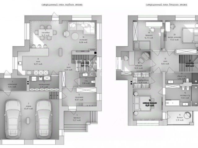 Большая парковочная зона с навесом на 6 машин, просторная двухэтажная веранда, на цокольном и первом этаже.