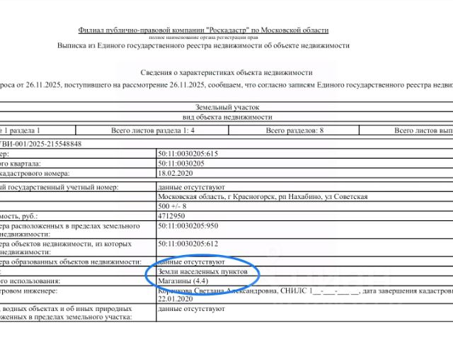 ОТЛИЧНЫЙ ВАРИАНТ для БИЗНЕСА! Продается ЗЕМЕЛЬНЫЙ УЧАСТОК с расположенным на нём ЗДАНИЕМ МАГАЗИНА под коммерческую деятельность в центре пгт. Нахабино Красногорского г.о. МО. В потенциале на участке можно еще построить здание(я) под магазины площадью до 197,8м2. 1. ПАРАМЕТРЫ УЧАСТКА. Кадастровый номер: 50:11:0030205:615. Площадь: 500 +/- 8. Категория земель: Земли населенных пунктов. Виды разрешённого использования: Магазины (4.4). Границы участка (межевание) определены. Участок огорожен металлическим забором (высота 2,0м). Расположение: 1-я ЛИНИЯ от дороги (ул. Советская). Дорога асфальтированная. Въезд ч/з ворота участка. Шаговая доступность до МЦД-2 Нахабино. 2. ПАРАМЕТРЫ ЗДАНИЯ. Кадастровый номер: 50:11:0030205:950. Площадь: 52м2 + складская пристройка. Назначение: нежилое, этажность: 1, в том числе подземных 0, материал стен: бетон, год завершения строительства: 2013г. Фундамент ленточный ж/б с гидроизоляцией (глубина 1,0 м ширина 0,3м). Есть въезд через ворота здания. Техническое описание (по проекту) и состояние здания - см. ФОТО. В здании на данный момент готовый арендный бизнес. 3. КОММУНИКАЦИИ — всё готово: - водопровод центральный (скоро поставят счетчики); - канализация центральная; -электричество 15 кВт; - газ по границе участка. СВОБОДНАЯ ПРОДАЖА, полная цена в ДКП, 1 взрослый собственник, долгов и обременений нет. Оперативный показ по договоренности. Все подробности по телефону.