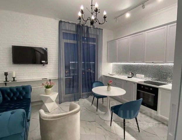 Гостиная с диваном (раскладывается в 2двуспальную кровать), большим телевизором 4к, рабочим столом, скамейкой для пресса, кондиционером, шторами, тюлью, роутером для стабильной раздачи интернета по всей квартире - все продается вместе. Кухня оборудована холодильником, вытяжкой, чайником, микроволновкой, варочной панелью и духовкой.