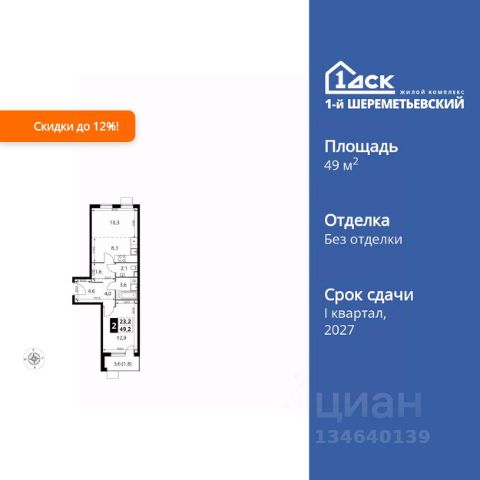 ТОЛЬКО 4 ДНЯ ДО 10.02 • Дополнительная скидка 10% • Ставка 10% по стандартной ипотеке для всех без наценок • Ставка 3,5% по семейной ипотеке Успейте купить выгодно! Прямая продажа от застройщика! Жилой Комплекс класса Комфорт Плюс. Продаётся 2-к квартира номер 525 общей площадью 49.4 кв.м. на 16-м этаже 16 этажного здания. Отделка Whitebox. Цена с учётом скидки. Особенности квартиры: - Просторная спальня, в которой можно разместить большую кровать. - Распашная планировка - отличное сочетание удобства и свободы. - Раздельный санузел - больше удобства для всех членов семьи. - Евроформат - просторное и удобное жилье с отличной планировкой. - Увеличенная высота потолков - ощущение простора и легкости. - Можно оборудовать рабочее место - комфорт для работы и учёбы. - Кухня-гостиная - идеальное пространство для встреч с близкими. - Возможность добавить спальное место - дополнительный комфорт для гостей. - Просторная лоджия - идеальное место для уютных вечеров. Квартира с предчистовой отделкой (White box). Вам не придется заниматься черновыми и трудоёмкими работы, а чистовую отделку и дизайн - сделайте на свой вкус. Информация о комплексе: ЖК 1-й Шереметьевский расположен в самом центре Подрезково, от него всего 6 минут пешком до одноименной станции ж/д и планируемой к открытию МЦД-3. В комплексе яркие и уютные, лобби, большая колясочная, лапомойка. Благодаря гостевому санузлу на 1 этаже прогулки станут по-настоящему долгими. Два лифта пассажирский и грузовой.Во всех корпусах 1-го Шереметьевского там устроены кладовые, а в корпусах 3-5 есть подземный паркинг. В ЖК 1-й Шереметьевский разнообразие площадей и планировок. Большие кухни-гостиные: в них два окна или больше. Во всех квартирах площадью от 40 кв.м. и выше спроектировано 2 санузла. Большие остекленные лоджии с отделкой. Система Умная квартира, реализованная в 1-м Шереметьевском. В каждой квартире установлены датчики протечек и запорные вентили с электроприводом, которые самостоятельно перекрывают воду в случае аварии. Мобильное приложение управляет группами электропотребителей: даже если вы забыли утюг включенным, можно обесточить его дистанционно. Транспортная доступность: - Общественный транспорт: До ближайших станций метро Планерной и Войковской около 40-50 минут на автобусе. 6 минут до ЖД станции Подрезково (МЦД-3) - Личный автотранспорт: Удобный выезд на Ленинградское шоссе позволяет быстро добираться до МКАДа и в центр Москвы, до платной трассы М11 и в аэропорт Шереметьево. 3 минуты до Ленинградского ш. 10 минут до платной трассы М11 15 минут до МКАД 20 минут до ст. м Войковская 25 минут до ст. м Планерная Внутренняя инфраструктура: 1-й Шереметьевский не только сокращает время, которое вы будете проводить в дороге. Но и предпринимает многое, чтобы вы меньше ездили и чаще ходили. На первых этажах корпусов разместятся фрешмаркеты и пункты выдачи маркетплейсов, салоны красоты и химчистки, кофейни и пекарни всё, что необх