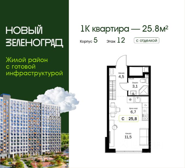 Квартира в ЖК "Новый Зеленоград" | Студия | 23.5 м² | 17 этаж из 18 | Срок сдачи — IV кв. 2026 года Откройте для себя комфорт и экологию в современном жилом комплексе "Новый Зеленоград" в окружении лесов и водоемов всего в 500 метрах от Зеленограда. Экологичная локация: Живите в гармонии с природой, не отказываясь от удобств города! Заповедные леса и водоемы — идеальное место для прогулок и активного отдыха 5 минут до Зеленограда — развитая городская инфраструктура 25 минут до МКАД — удобный выезд Современный комфорт: Архитектура с яркими фасадами и большими окнами Кладовые и просторные входные группы Высокие потолки (2,6 м), продуманные планировки с просторными комнатами и гардеробными Квартиры без отделки или с готовым ремонтом Развитая инфраструктура: Уже открыты детский сад и начальная школа с современными образовательными программами Магазины, кафе, аптеки, пункты выдачи и сервисы на первых этажах Игровые площадки для детей разных возрастов Спортивные площадки и футбольное поле, скейтпарк и зона воркаут для активного образа жизни Безопасность и удобство: Благоустроенные дворы без машин, видеонаблюдение Автомобильная парковка на территории Собственная управляющая компания Финансовые условия и программы покупки: Все виды ипотеки, включая гос. поддержку с высоким процентом одобрения Рассрочка до 3 лет — покупка квартиры стала еще доступнее ЖК "Новый Зеленоград" — идеальный выбор для тех, кто ценит экологию, комфорт, развитую инфраструктуру и выгодные условия покупки. Узнайте подробности и забронируйте квартиру у наших менеджеров!