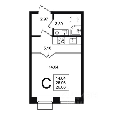 Жилая комната 14 кв.м имеет прямоугольную форму, что позволит гармонично разместить мебель и зонировать пространство.