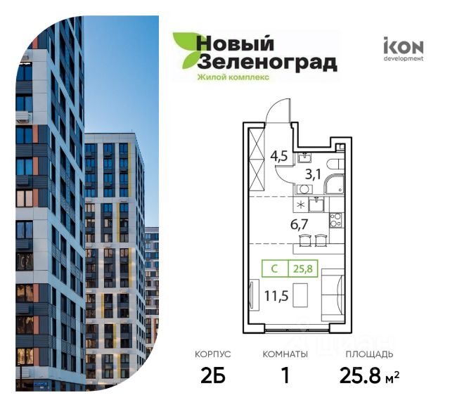 Студия с двумя окнами и лучшей планировкой в ЖК Новый Зеленоград 25кв.м на удобном 4-ом этаже, в одном из лучших домов данного ЖК.