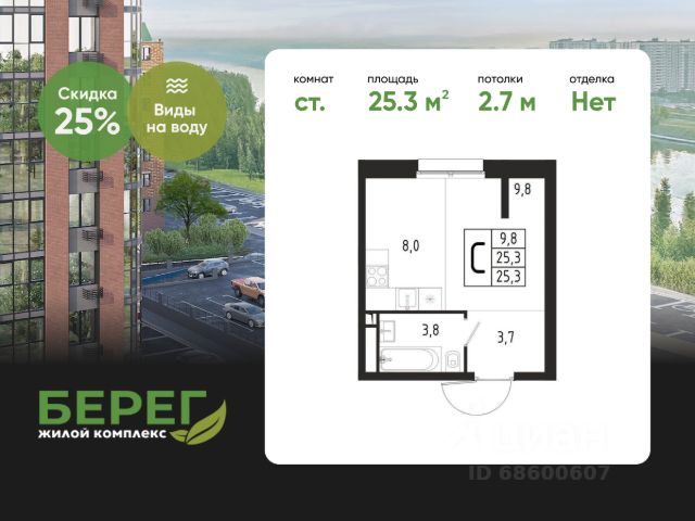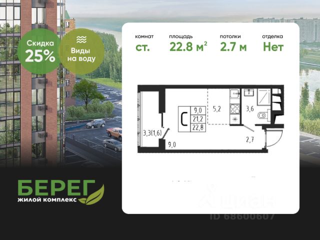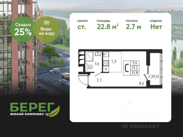БЕЗ ПЕРВОНАЧАЛЬНОГО ВЗНОСА! Прямая продажа от застройщика! Жилой Комплекс класса Комфорт. Продаётся квартира-студия номер 264 общей площадью 21.7 кв.м. на 2-м этаже 6 этажного здания. Предчистовая отделка. Цена с учётом скидки. Особенности квартиры: - Организуем показ в удобное для вас время! - Линейная планировка - максимальная функциональность и удобство. - Увеличенное количество окон - дополнительное освещение и свежий воздух. - Гардеробная - удобство для хранения и организации вещей. Квартира с предчистовой отделкой. Вам не придется заниматься черновыми и трудоёмкими работы, а чистовую отделку и дизайн - сделайте на свой вкус. Информация о комплексе: "1-й Химкинский": гармония современного города и природы на 102 га у Химкинского леса и канала им. Москвы. Развитая инфраструктура: ТЦ, школы, спорткомплекс с термами и СПА, парк развлечений. Идеальный баланс для жизни в окружении зелени и городского комфорта. Транспортная доступность: ЖК "1-й Химкинский" дает возможность выбрать любой способ передвижения как до города, так и до самых разных объектов, которые могут представлять интерес для его жителей. Не важно, какой способ передвижения вы предпочитаете, успевать всегда и везде можно вне зависимости от выбора транспорта. - 8 мин. пешком (800 м) до остановки "Золотая Арка" -10 мин пешком (1 км) до остановки "Поворот на Ивакино" Внутренняя инфраструктура: Безопасность: закрытые дворы без машин, безбарьерная среда, сквозные подъезды, камеры на детских площадках с трансляцией на смартфон. Отдых: семейный парк развлечений, двухэтажный ТЦ 8 000 м² с фудкортом. Образование: 4 детских сада, 2 муниципальные школы. Спорт: закольцованный веломаршрут, спорткомплекс с термами, тренажерный зал, воркаут зоны. Инфраструктура: поликлиника со станцией скорой помощи, пожарное депо. Паркинг: подземный паркинг, кладовые на -1 этаже, СТО и автомойка на территории. Квартира с предчистовой отделкой - ваш дизайн без черновых работ Продам квартиру-студию в микрорайоне Клязьма-Старбеево в городе Химки.