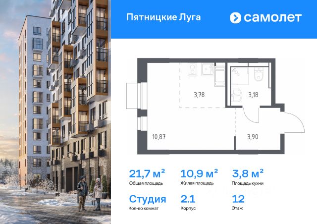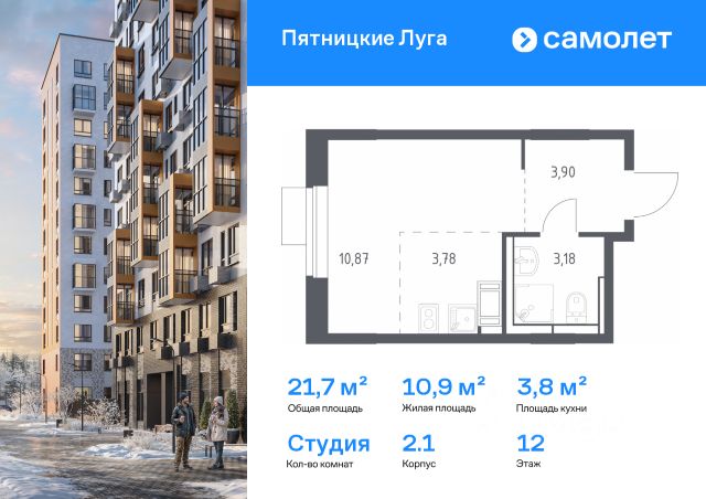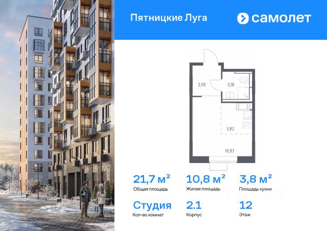 Строим кварталы для жизни с заботой о будущем. Предлагается квартира студия комфорт-класса 21,73 кв.м в корпусе 2.1 на 12 этаже, в ЖК "Пятницкие Луга" Квартира с чистовой отделкой. Доступность дополнительных опций уточняйте у застройщика. Приобрести квартиру возможно по специальным акциям от застройщика, с текущими условиями акций можно ознакомиться в блоке "Акций". Цена динамическая и может отличаться, уточняйте актуальность у застройщика. Жить в проекте "Пятницкие Луга" — значит просыпаться с видом на лес или реку. До Пятницкого шоссе — 5 минут на авто, до метро "Пятницкое шоссе" — 12 минут. В 2025 году появится тоннель с выездом на Путилковское шоссе. Рядом лесопарки и усадьба. На территории комплекса появятся 4 детских сада, 2 школы и поликлиника. Во дворе — сквер, внутренний сад, плейхаб и спортхаб. Квартиры с отделкой. Доступна улучшенная отделка, мебель и декор.