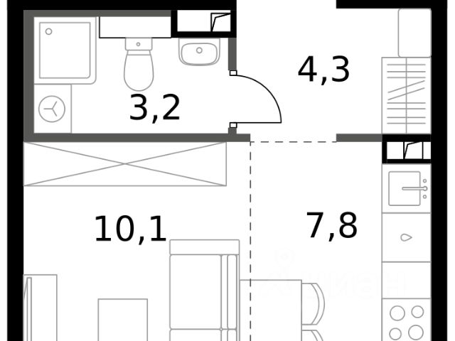 Потолки: кухня, комната — натяжной потолок; коридор, санузел — натяжные или ГКЛ