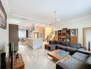 Стоит отметить очень удачное расположение корпуса на территории самого поселка - в самой дальней точке от дороги и КПП. Соседи по блоку таунхаусов уже сделали ремонты и постоянно проживают. Окна таунхауса выходят на прогулочную аллею. Установлен газовый котел Buderus, разведена система отопления, установлены немецкие радиаторы. Площадь таунхауза по БТИ составляет 210 кв. м, однако можно сделать перекрытие между вторым и третьим этажом (высота потолков до 7 метров) и увеличить жилую площадь на 60 кв. м.