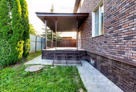 Дом сделан в сочетании дерева и керамогранита , покрашен без воздушным способом дорогой моющейся эко краской Тикурила Джокер (сертифицирована для окраски детских учреждений) что позволило сохранить всю фактуру дерева и экологичность, кровля натуральная черепица.
