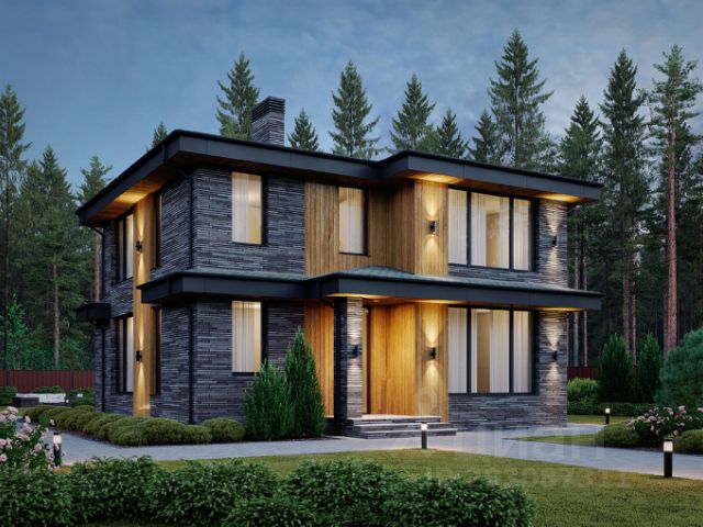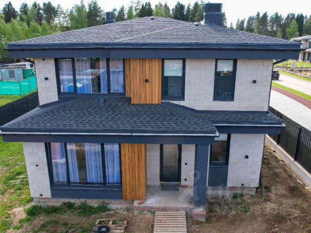 Дом построен из керамического блока Porotherm, перекрытия железобетонные. Кладка керамического блока произведена под техническим надзором компании Porotherm. В отделке фасада применен декоративный камень White Hills, вставки планкен, вставки декоративной штукатурки. Кровля покрыта черепицей Технониколь (3 слоя) в цветовом исполнении проекта. Дом выполнен в современном стиле.