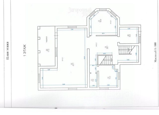 Цокольный этаж: санузел, гардеробная, сейфовая, помещение для персонала, помещение для оборудования бассейна, два технических помещения, кухня.