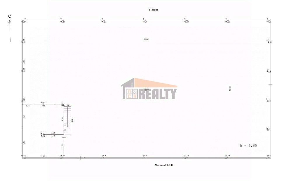 Здание ангарного типа. Площадь склада по полу - 720 кв.м. (остальной метраж- антресоль). Высота потолка по свесам кровли - 6,9м в коньке - 9,65 м. Стены - металлические профильные листы со стеклопакетами. Кровля - металлический профиль.