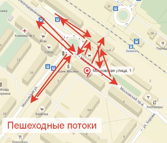 Помещение выгодно расположено в самом центре развитой торговой зоны, концентрирующей пешеходный трафик сразу четырех оживленных направлений: на станцию Химки и со станции, в/из ТЦ Citrus, в/из жилого массива в сторону улицы Кирова, по направлению к центру города и из центра по улице Московская. Трафик в часы-пик превышает 3000 чел/час. На улице расположения помещения возможна парковка автотранспорта.