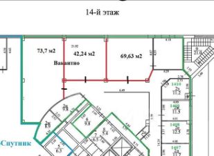 ПРЯМАЯ АРЕНДА. Офис площадью 111,8 м2 на 14 этаже с качественной отделкой в БЦ GREEN POINT (на плане выделены как 42 и 69 м2). Ставка 23.000 рублей за м2 в год с НДС и эксплуатацией.