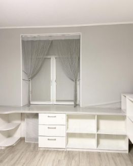 Гостиная: столешница из камня со шкафами и рабочим местом. На окнах жалюзи и шторы из нитей. Шкаф-купе кровать. Телевизор.