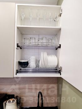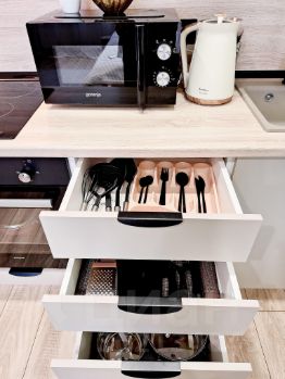 электрическая плита, холодильник, чайник, набор посуды и столовые приборы;