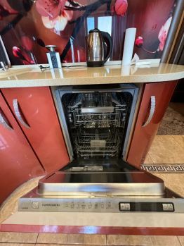 Есть все для комфортного проживания. В комнате двуспальная кровать с удобным матрасом средней жёсткости, большой диван, который раскладывается, кондиционер. На кухне встроенная дорогая техника bosch.