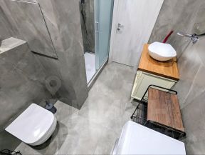 Санузел совмещенный, с душевой кабиной и стиральной машиной Bosch.