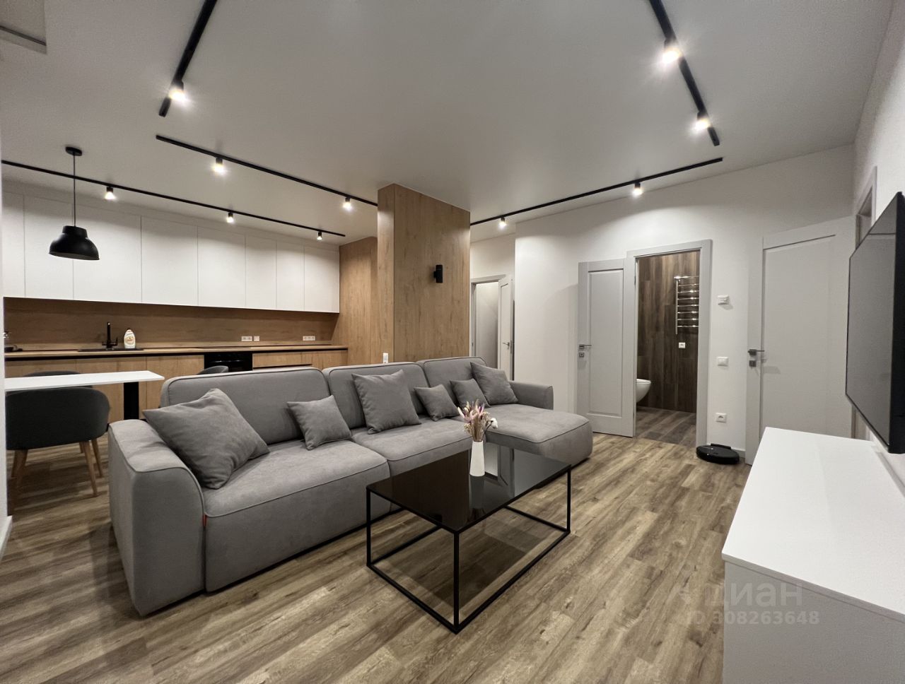 Стены покрашены в цвета благородных нейтральных оттенков, установлены натяжные потолки с точечными и трековыми светильниками. На кухне установлен гарнитур, укомплектованный современной бытовой техникой.