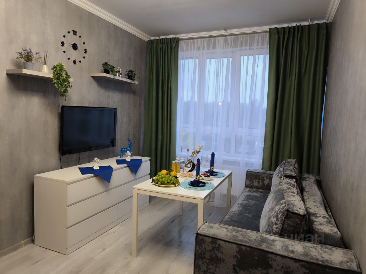 В Квартире: Спальня и гостиная с большими диванами для комфортного отдыха, кухня с современным гарнитуром, большой ЖК-телевизор.