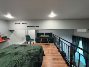 В студии есть вся необходимая мебель для комфортного проживания абсолютно НОВАЯ. На втором этаже спальня с двуспальной кроватью с качественным матрасом.