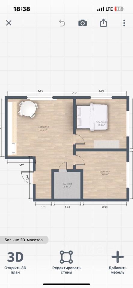 две жилые,изолированные комнаты 10,8кв и 12,4кв