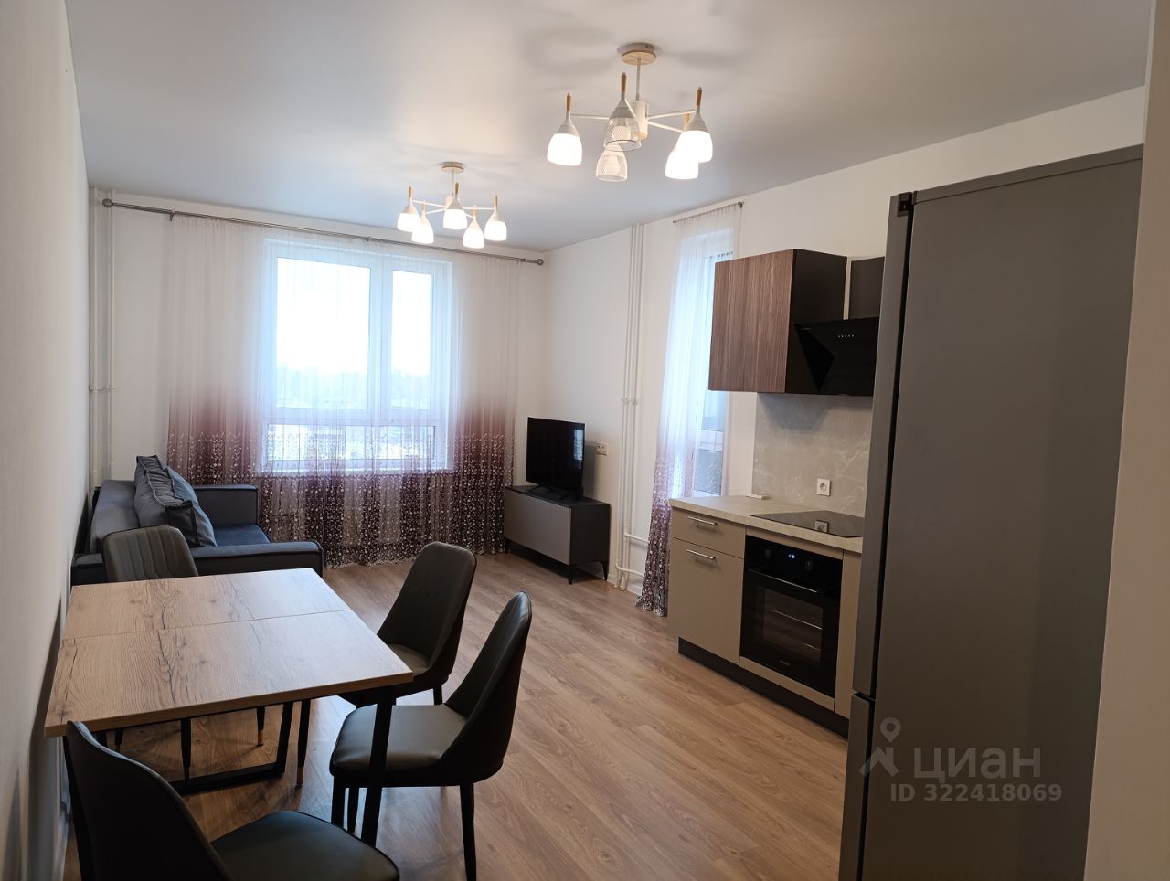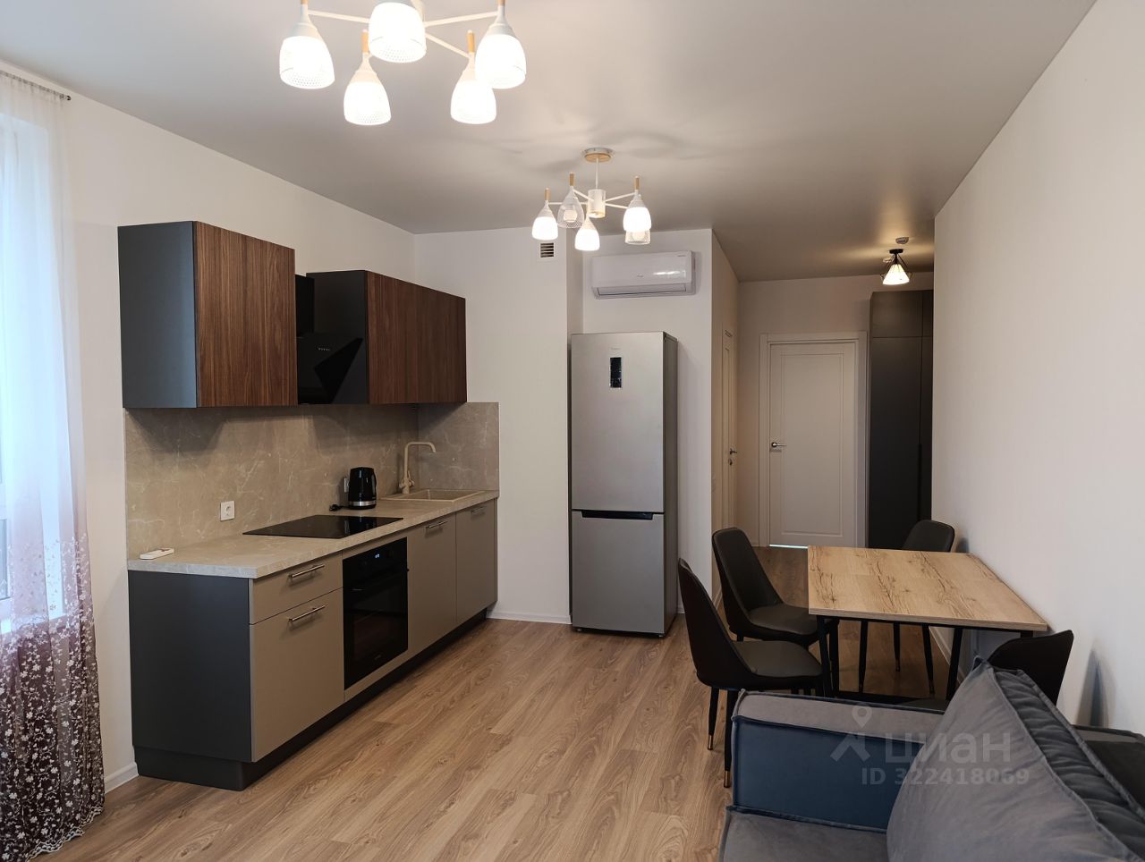 Кухня-гостиная: кухонный гарнитур, диван раскладной, комод, стол раскладной, 4 стула, варочная панель, духовой шкаф, посудомоечная машина 60 см, вытяжка, холодильник, качественный фильтр питьевой воды с обратным осмосом, кондиционер, электрический чайник, телевизор 43 дюйма.