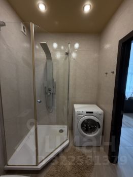 Компактный и функциональный, оснащён угловой душевой кабиной, стиральной машиной, раковиной и зоной хранения.