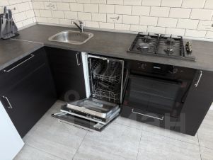 Угловая кухня, полностью укомплектованная всей необходимой техникой: варочная поверхность, духовой шкаф, вытяжка, посудомоечная машина и полноразмерный холодильник. Рядом расположена зона для обеденного стола.