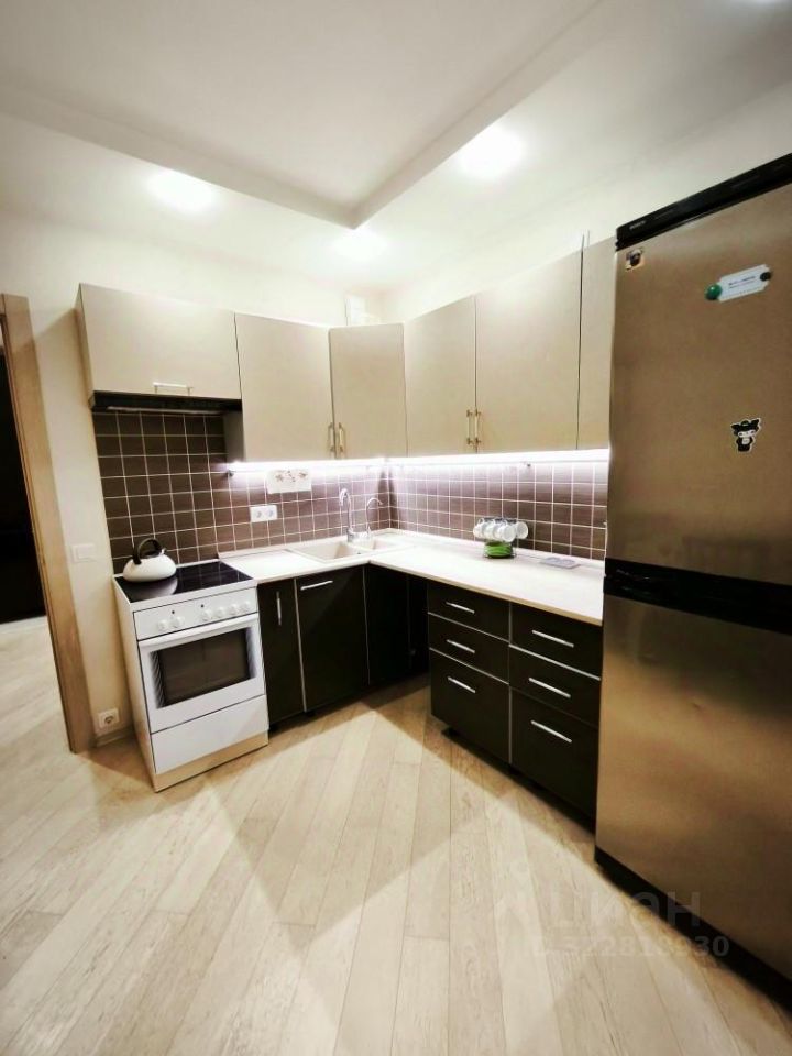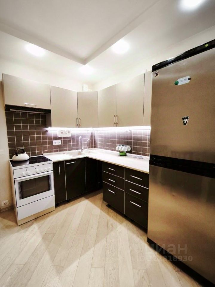 Просторная, функциональная кухня: встроенный кухонный гарнитур, холодильник, плита, вытяжка, микроволновая печь, чайник , посуда. Есть обеденная зона.