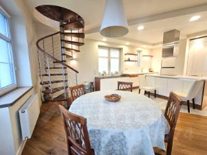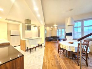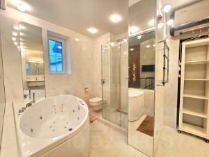 Интерьер выполнен в современном стиле по индивидуальному проекту. В квартире установлена качественная мебель и техника из-за рубежа. В числе удобств климат-контроль, высокоскоростной интернет, теплые полы, посудомоечная и стиральные машины и бойлер. Отделка выполнена из натуральных материалов: лестница из бука, продуманное освещение и антивандальная краска на стенах.